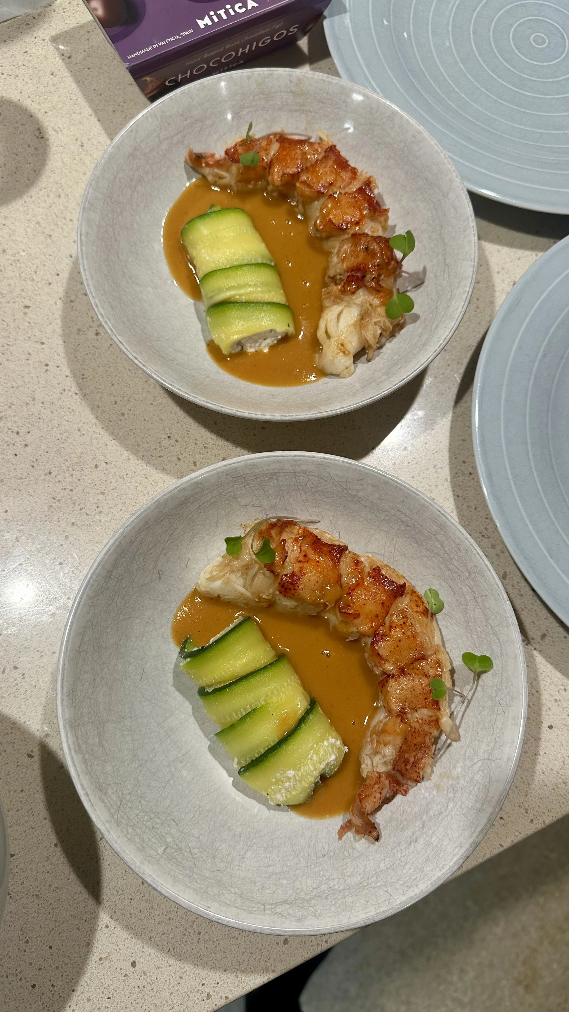 Lobster tail with zucchini ricotta roll and bisque veloute.